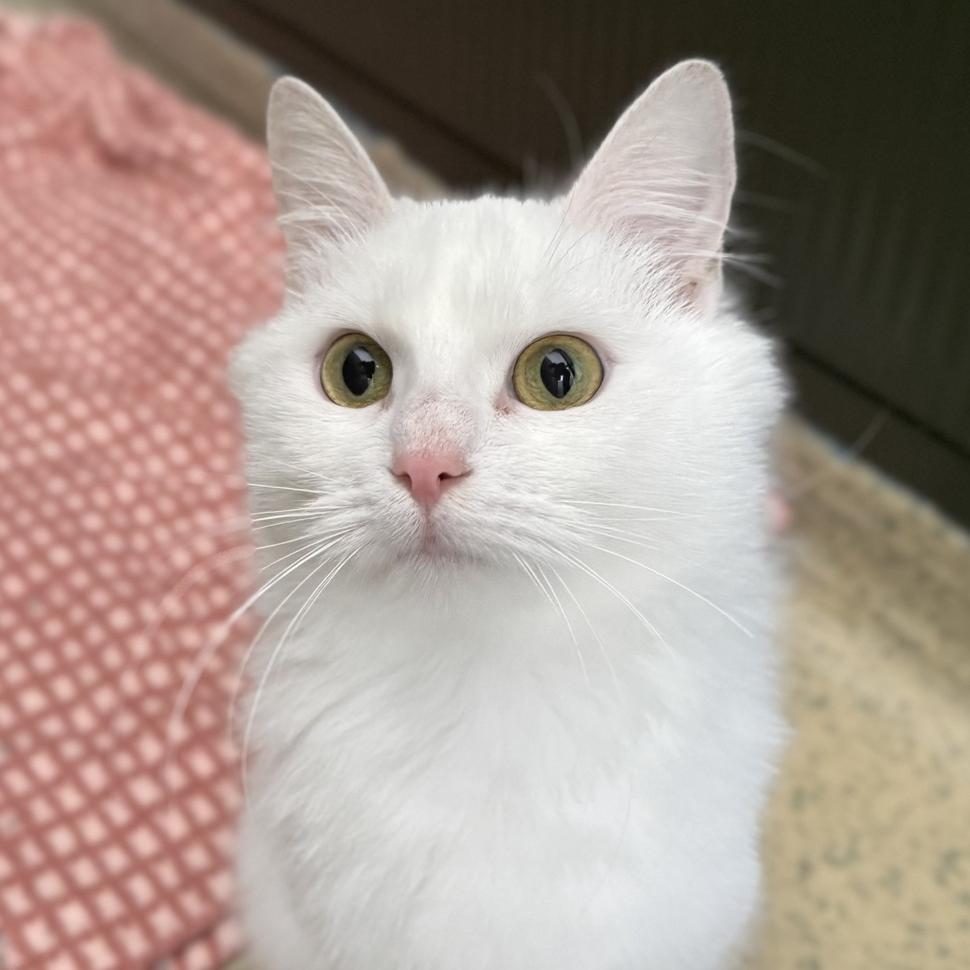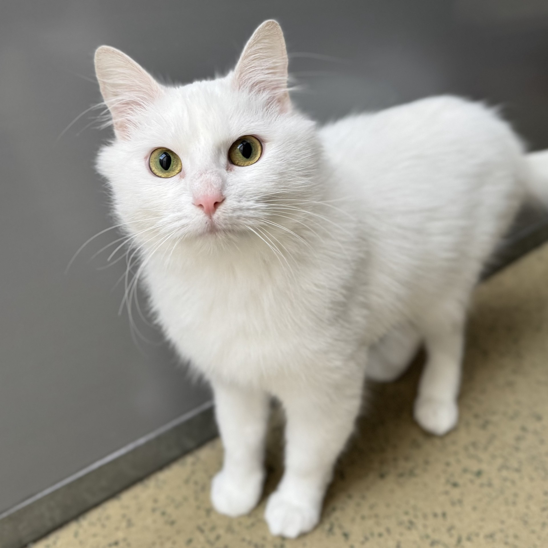 Ik ben Duchess, een prachtige witte poes van ongeveer 9 maanden oud. Een echte schoonheid, al zeg ik het zelf en dat vonden de katers in mijn vorige buurtje blijkbaar ook. Samen met mijn zoontje Oliver werd ik gevangen tijdens een TNR-actie (Trap-Neuter-Return – ofwel: vangen, neutraliseren en terugplaatsen). Maar zodra ik in de vangkooi zat hadden ze meteen door: ik ben helemaal geen verwilderde zwerfkat! Veel te sociaal en nieuwsgierig!